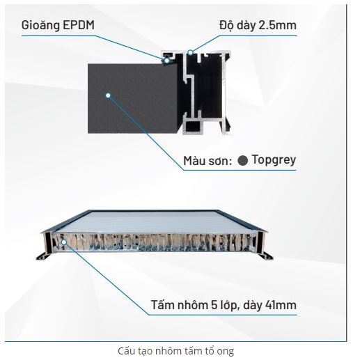 Nhôm sử dụng là hợp kim nhôm phun sơn PE hoặc PVDF tạo độ bền, thẩm mỹ cho sản phẩm.