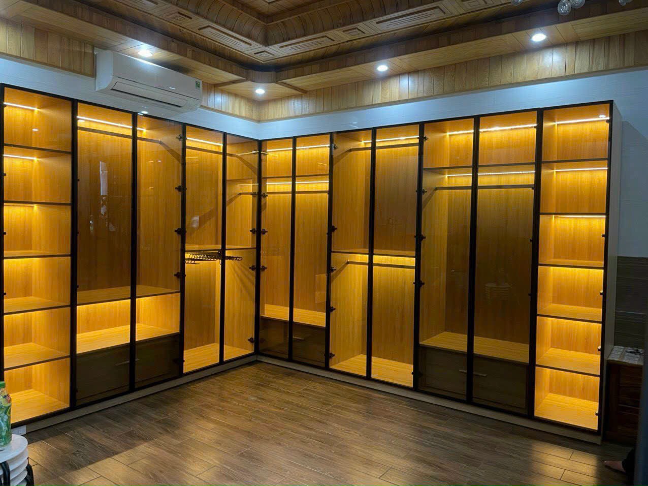 - Khi kết hợp với đèn LED bên trong tủ, ánh sáng lan tỏa qua lớp kính sẽ tạo ra một không gian lung linh, sang trọng. Hiệu ứng này không chỉ giúp tủ đồ trở nên nổi bật mà còn tạo không gian sáng sủa, dễ chịu.